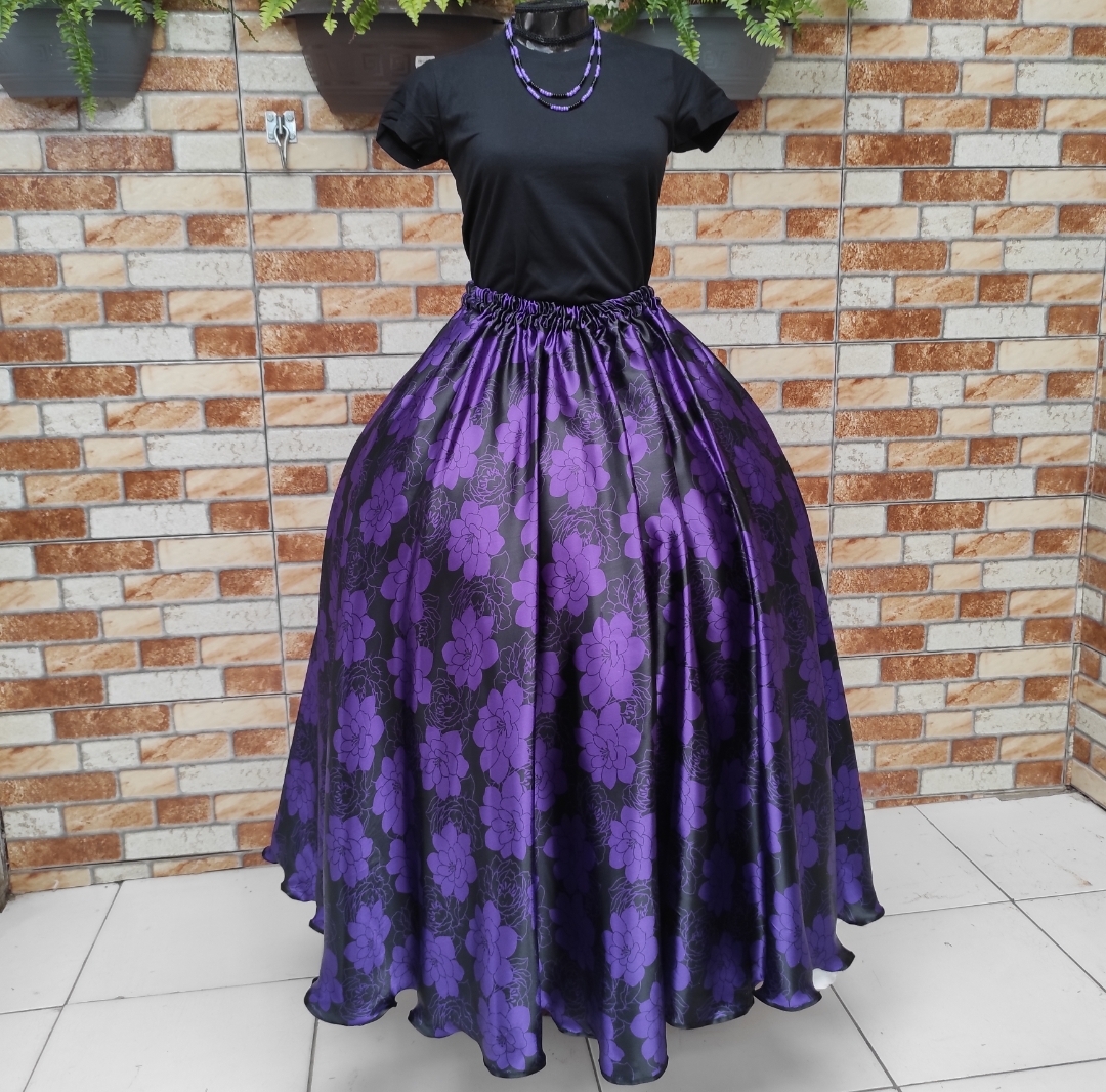 Saia em cetim preto estampado todas roxas