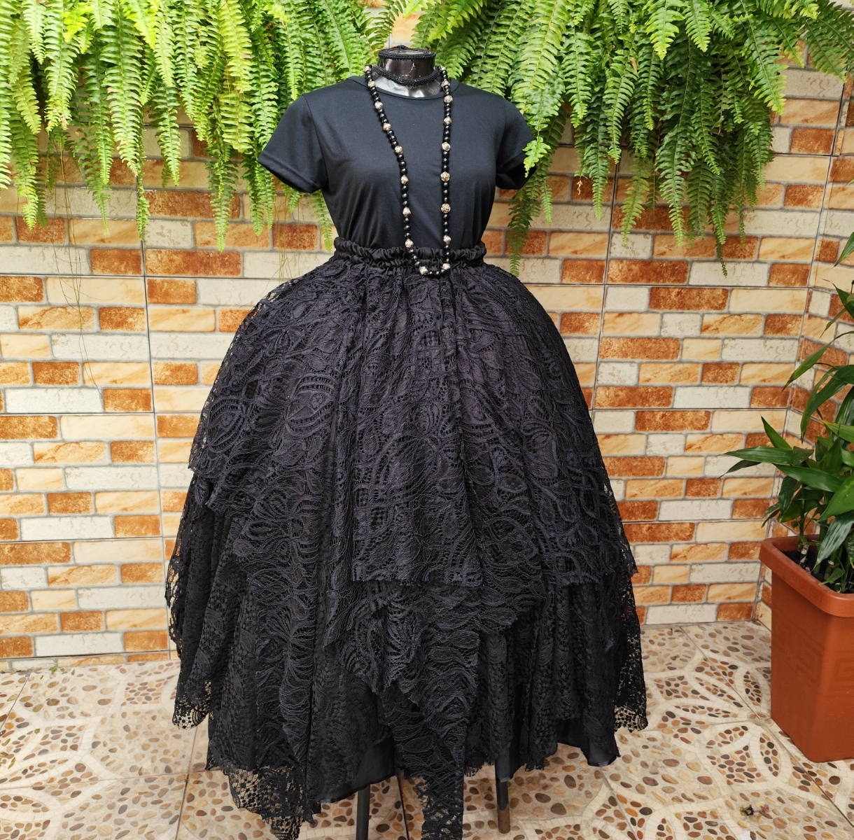 Saia em retalhos renda preta - Forro em Oxford preto