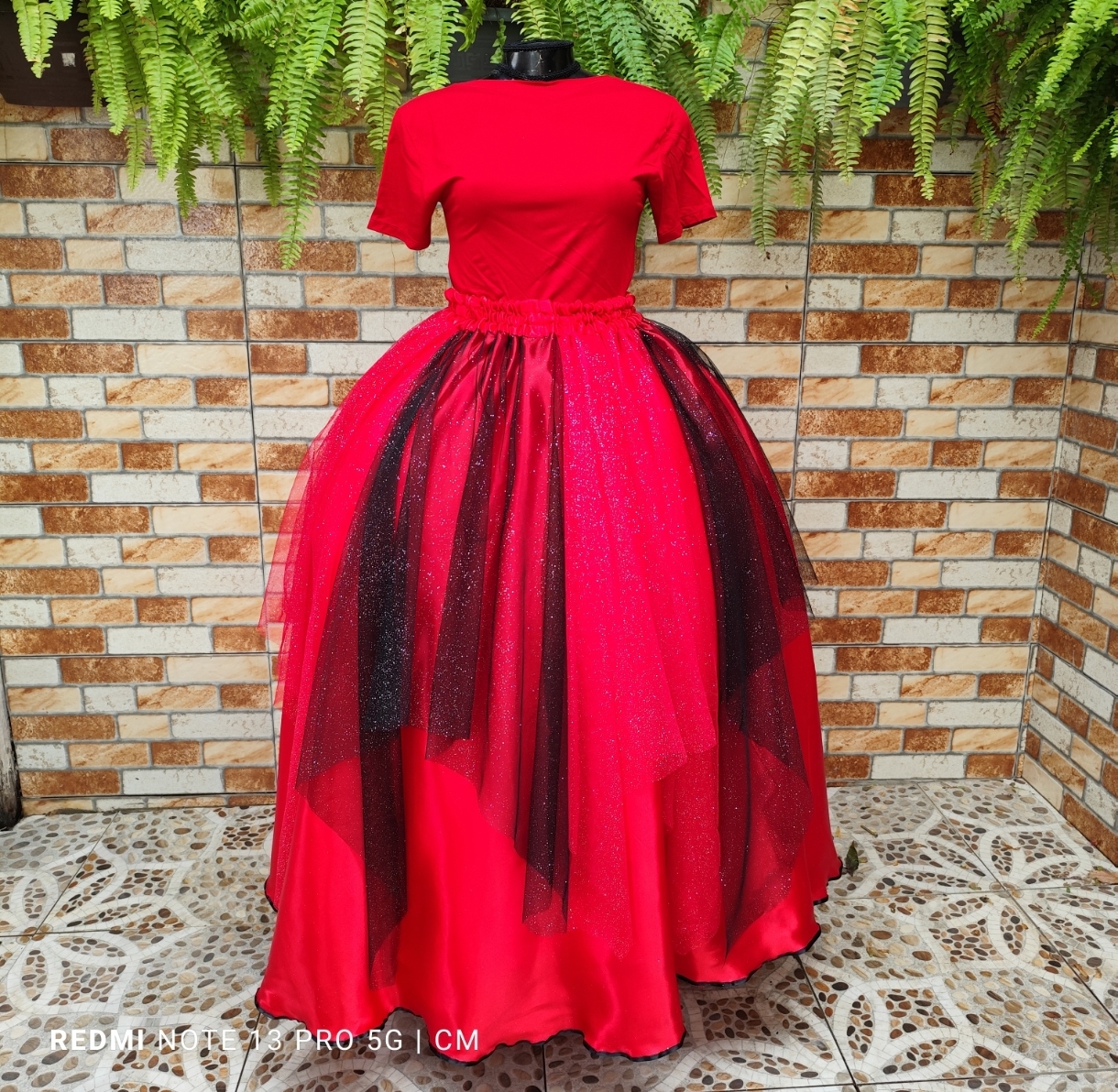 Saia vermelha em cetim lenços de tule/brilho preto e vermelho